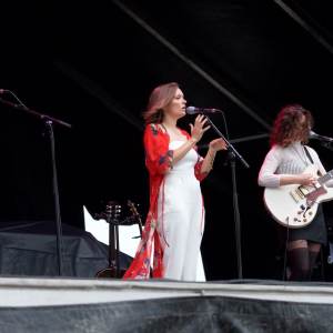 Rebecca Lovell of Larkin Poe performs on the Oak Stage Saturday