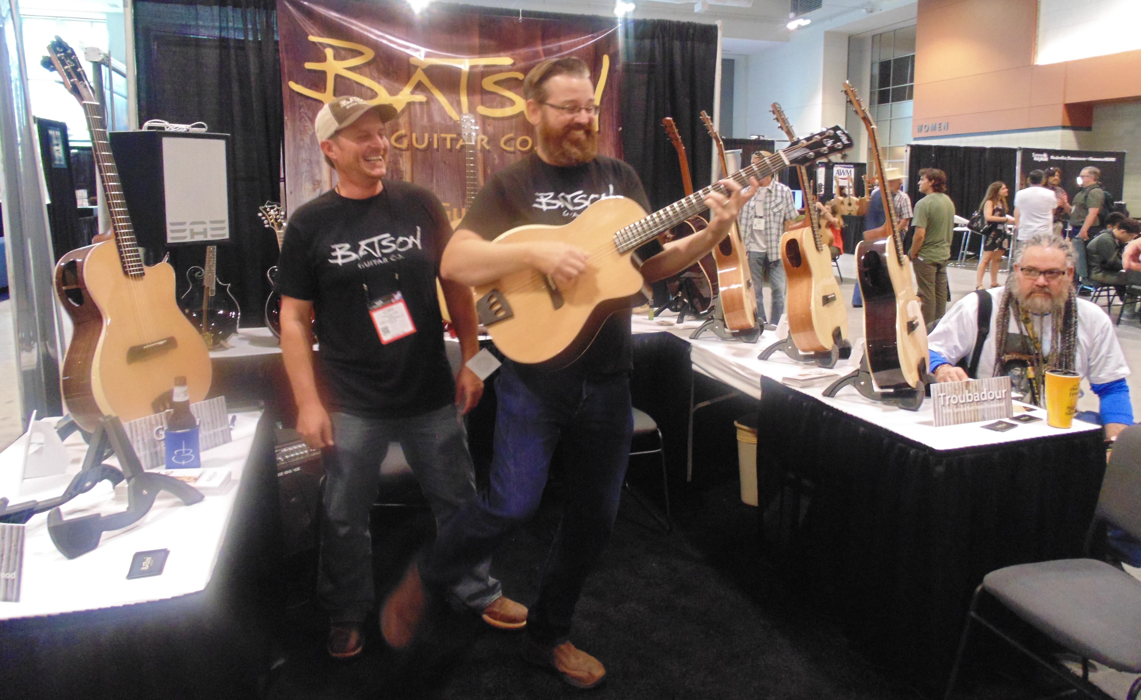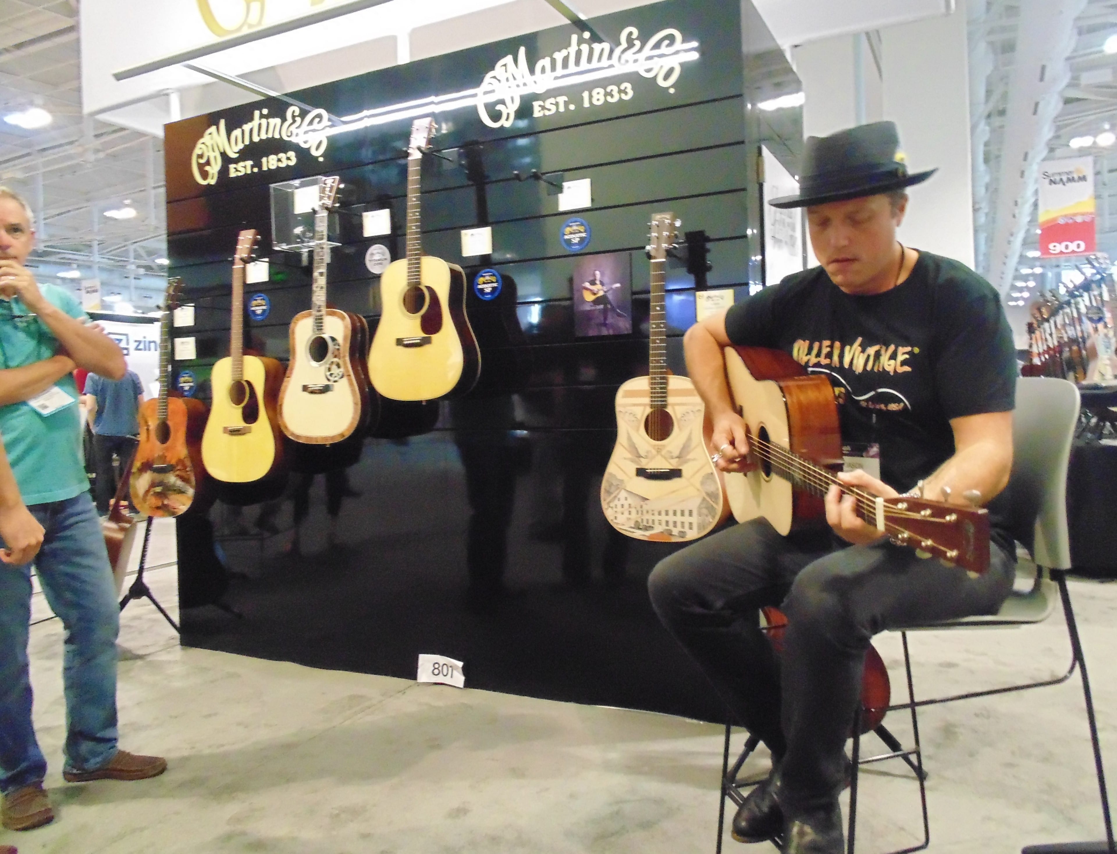Globetrotting blues-rocker Travis Bowlin performs at the booth of Axe Handler, which makes small portable guitar as hangers well as The Arc, a device that holds an extra guitar or banjo onstage for players who switch instruments during the course of a song.