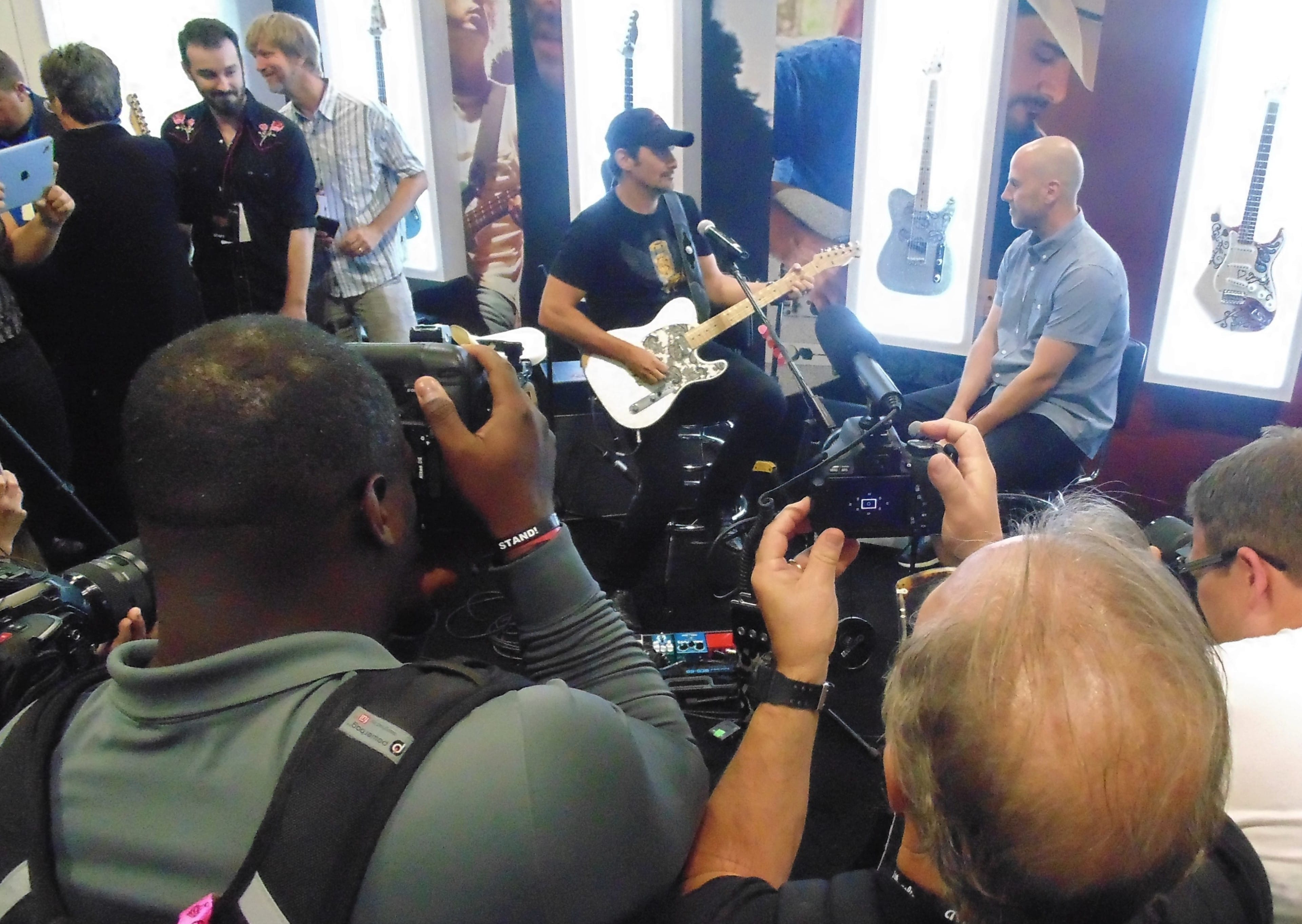 Brad Paisley draws a swarm of media as he hits some of the high points of the design of the new Brad Paisley Road Worn Telecaster, his new Artist Signature guitar for the company.