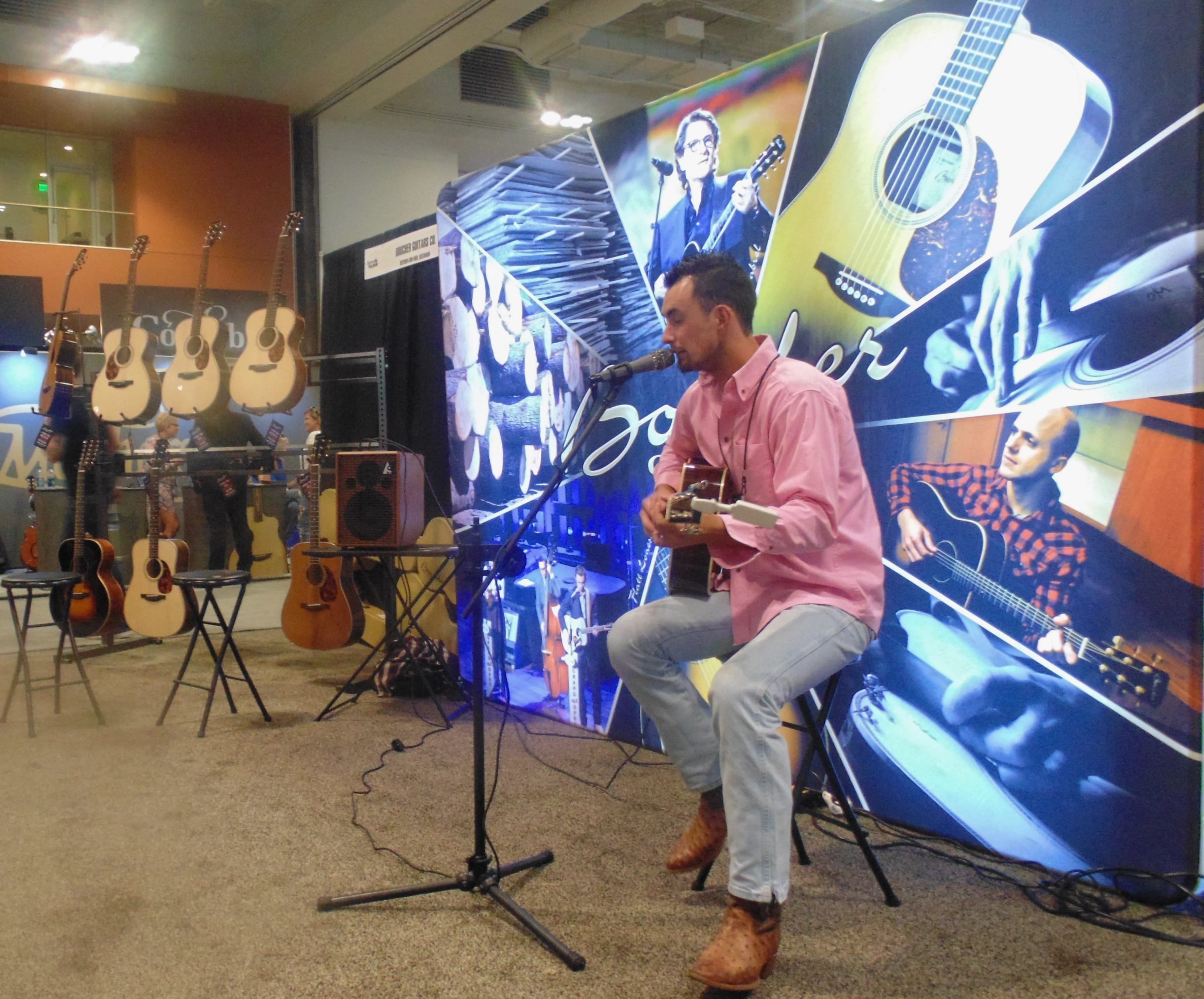 Singer Buddy Robertson of popular bluegrass band Flatt Lonesome performs at the booth of Boucher, the high-end acoustic guitar manufacturer from Quebec, Canada.