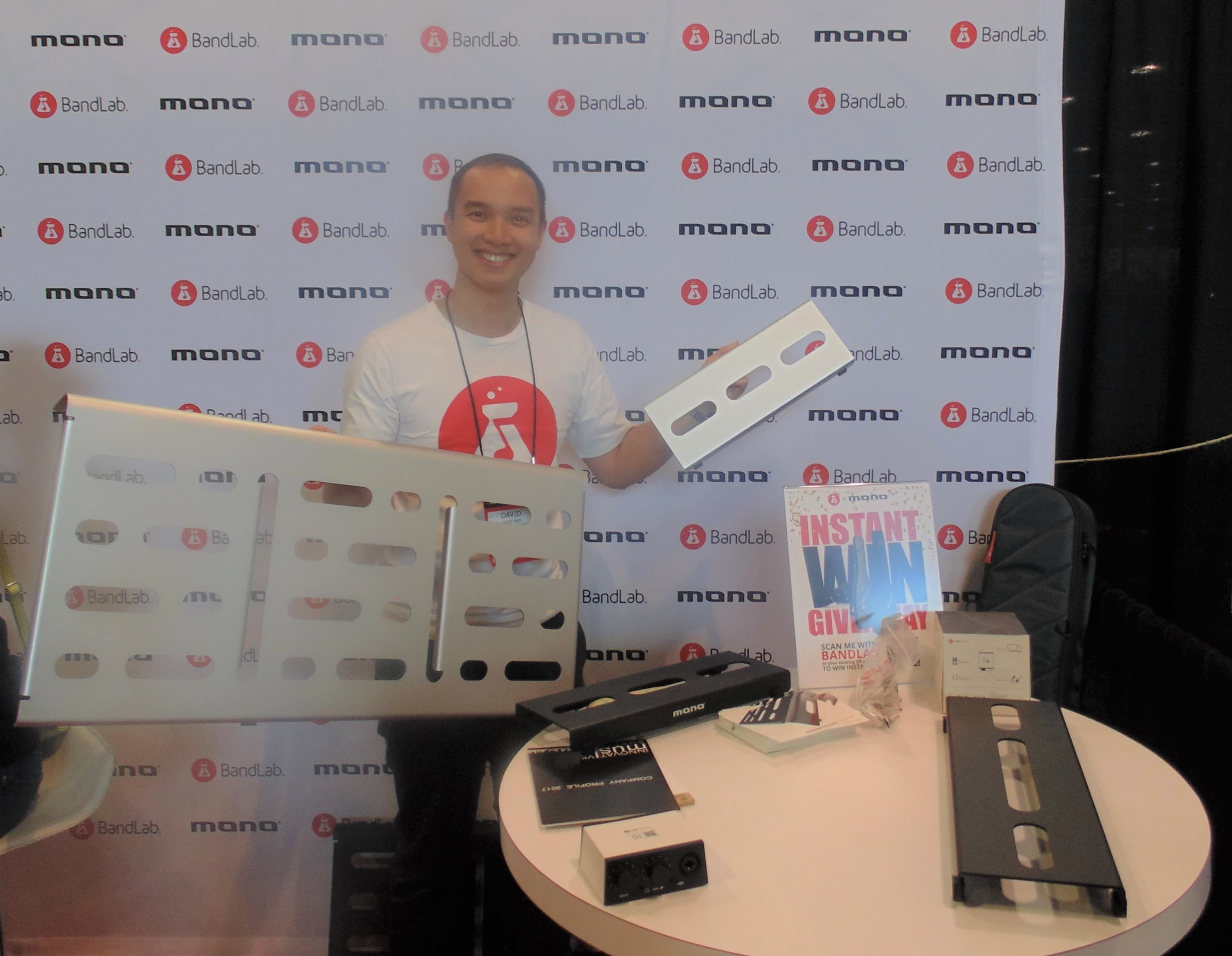David Nam of Bandlab displays some of the company’s Mono pedalboards, which work with Velcro applied to the underside of the board that sticks to the bottoms of the pedals.