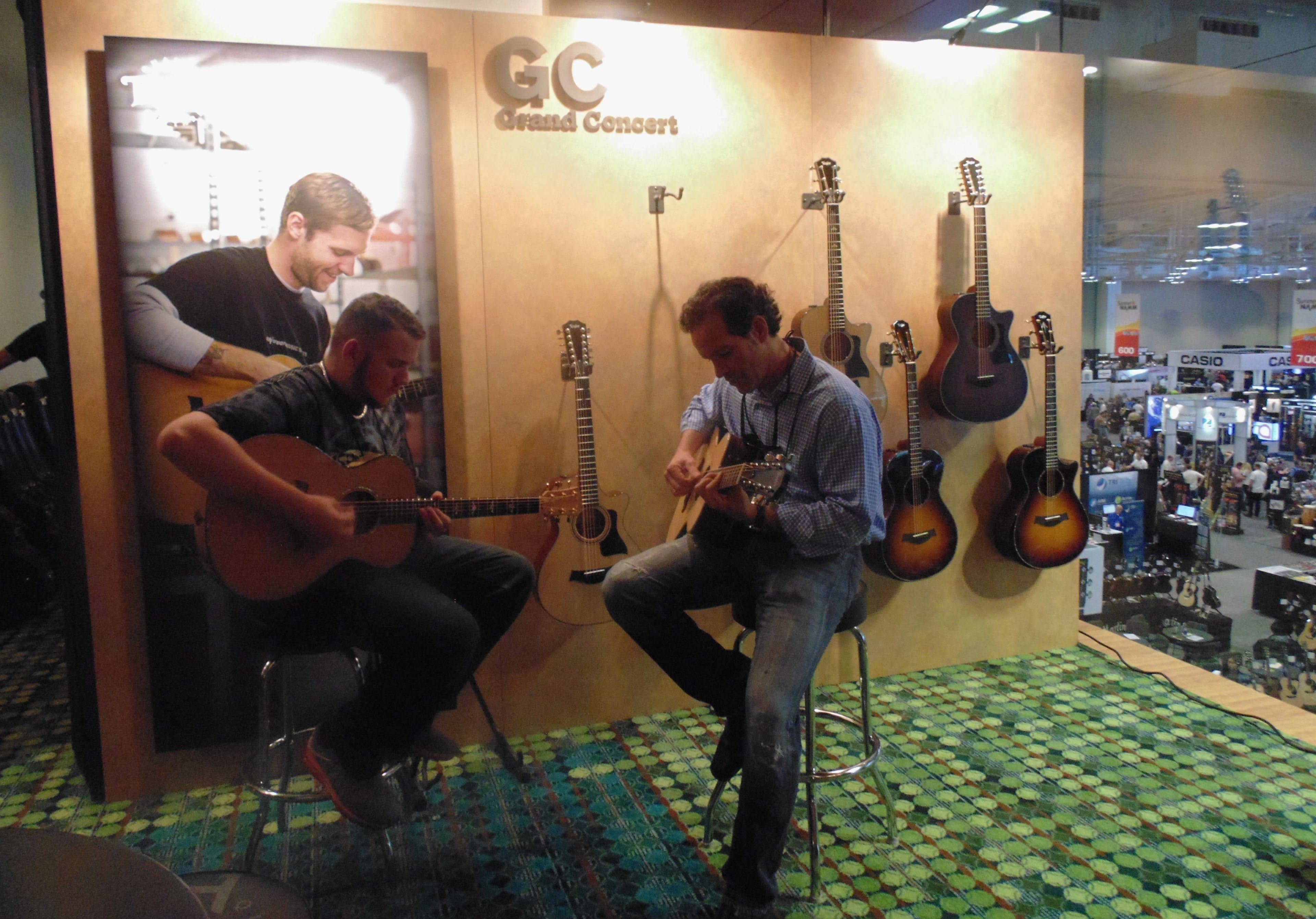 Nick LiVolsi of Loknob, whose product preserves settings on effects pedals, and David Galatas of Black Cherry, which makes intonations systems for Floyd Rose tremolos, each play a Custom GC in the upper-level Taylor Guitars room.