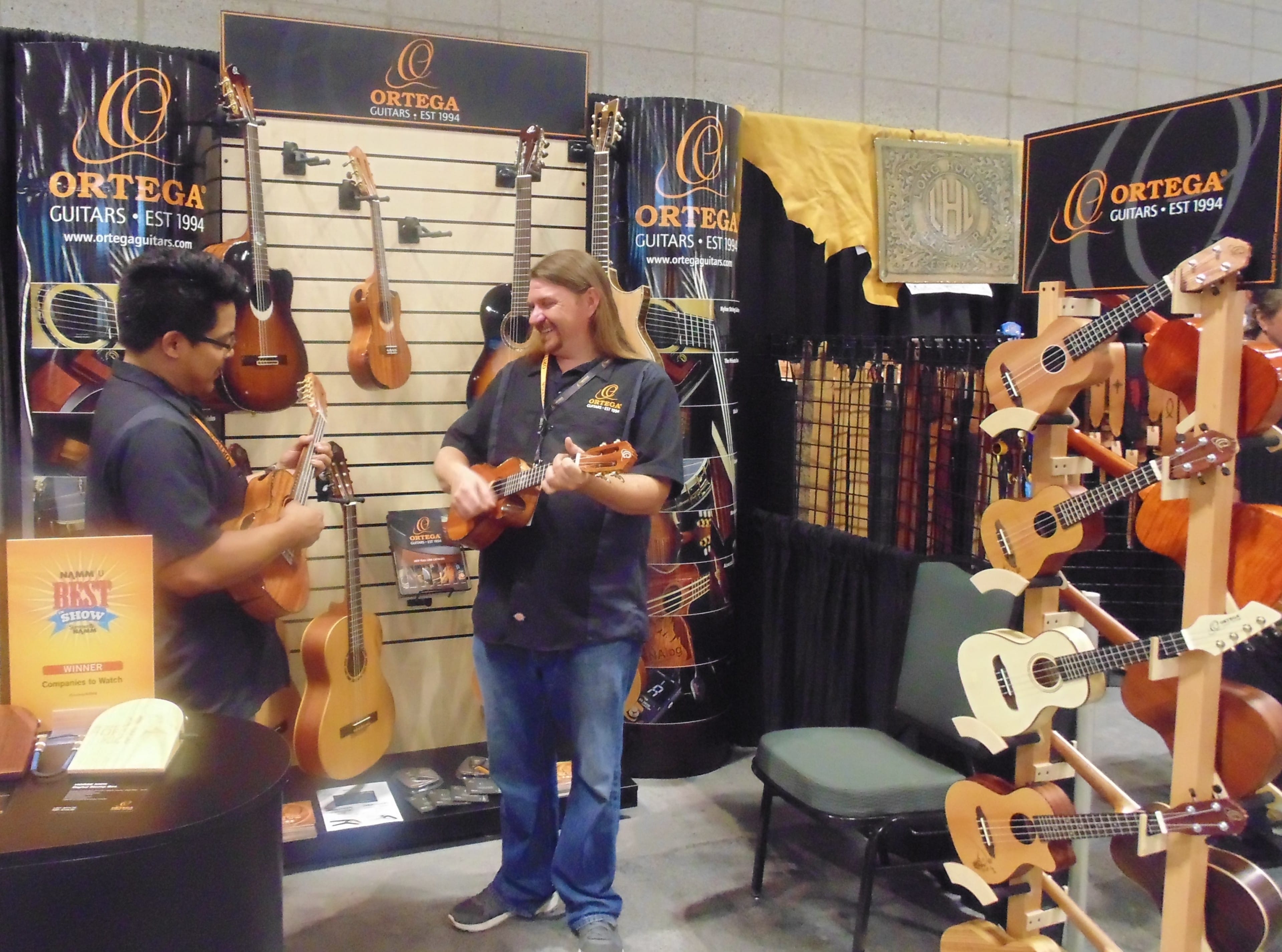 Marni Sison, left, and Frank Cantrell of German-owned Ortega Guitars pick ukuleles from the company’s Eclipse series, which was a winner of NAMM’s Best in Show award.