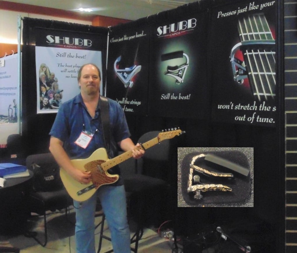 Gary Mobley of Shubb capos plays a Tele with one of the company’s hand-engraved capos with a jewel (see inset photo), for players who have the desire, and the budget ($150), for a more upscale and showmanlike capo.