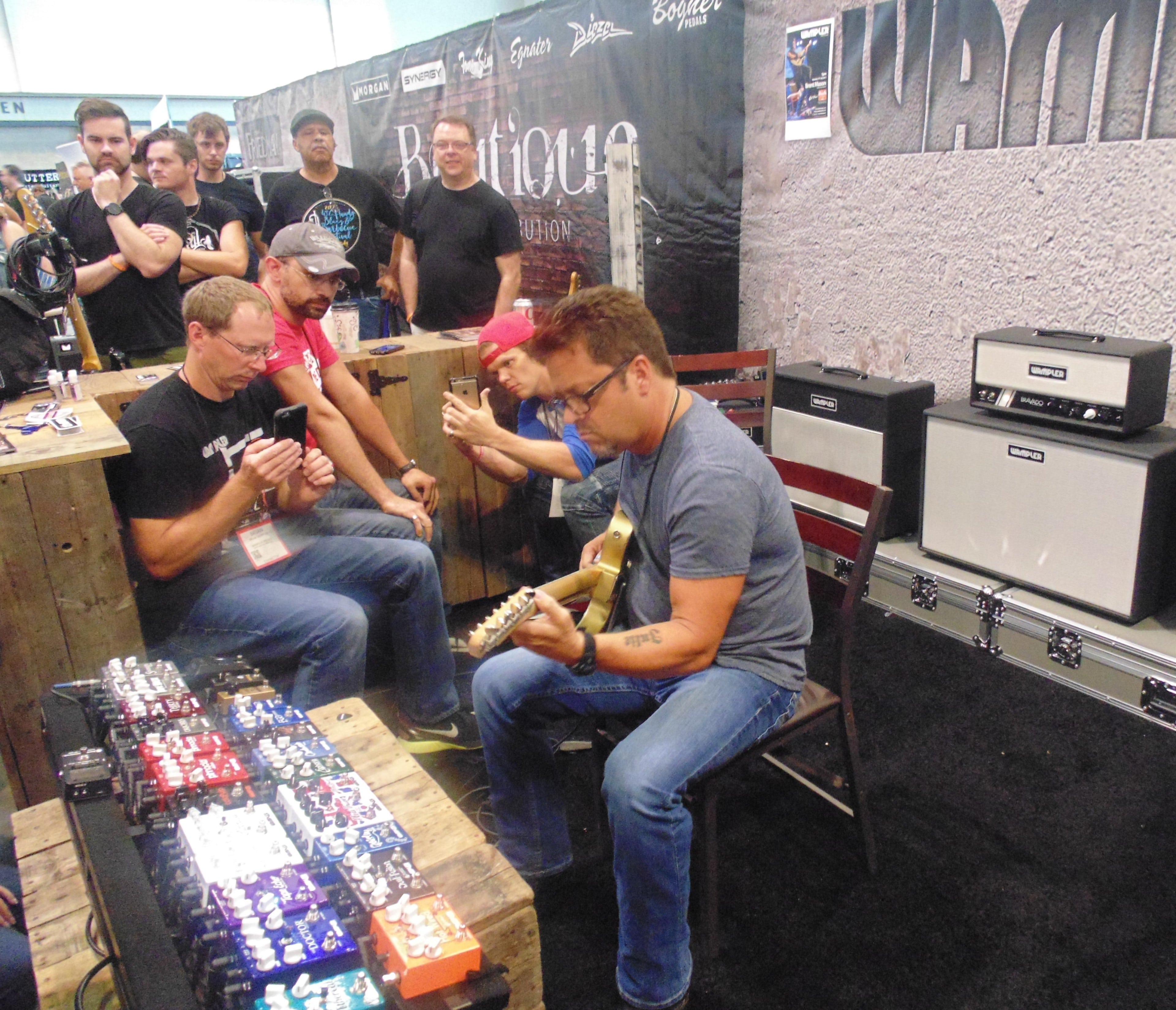 Nashville studio ace Brent Mason draws a crowd as he shows how to use the guitar effects pedals at the booth of Indiana-based Wampler Pedals and Amplifiers.