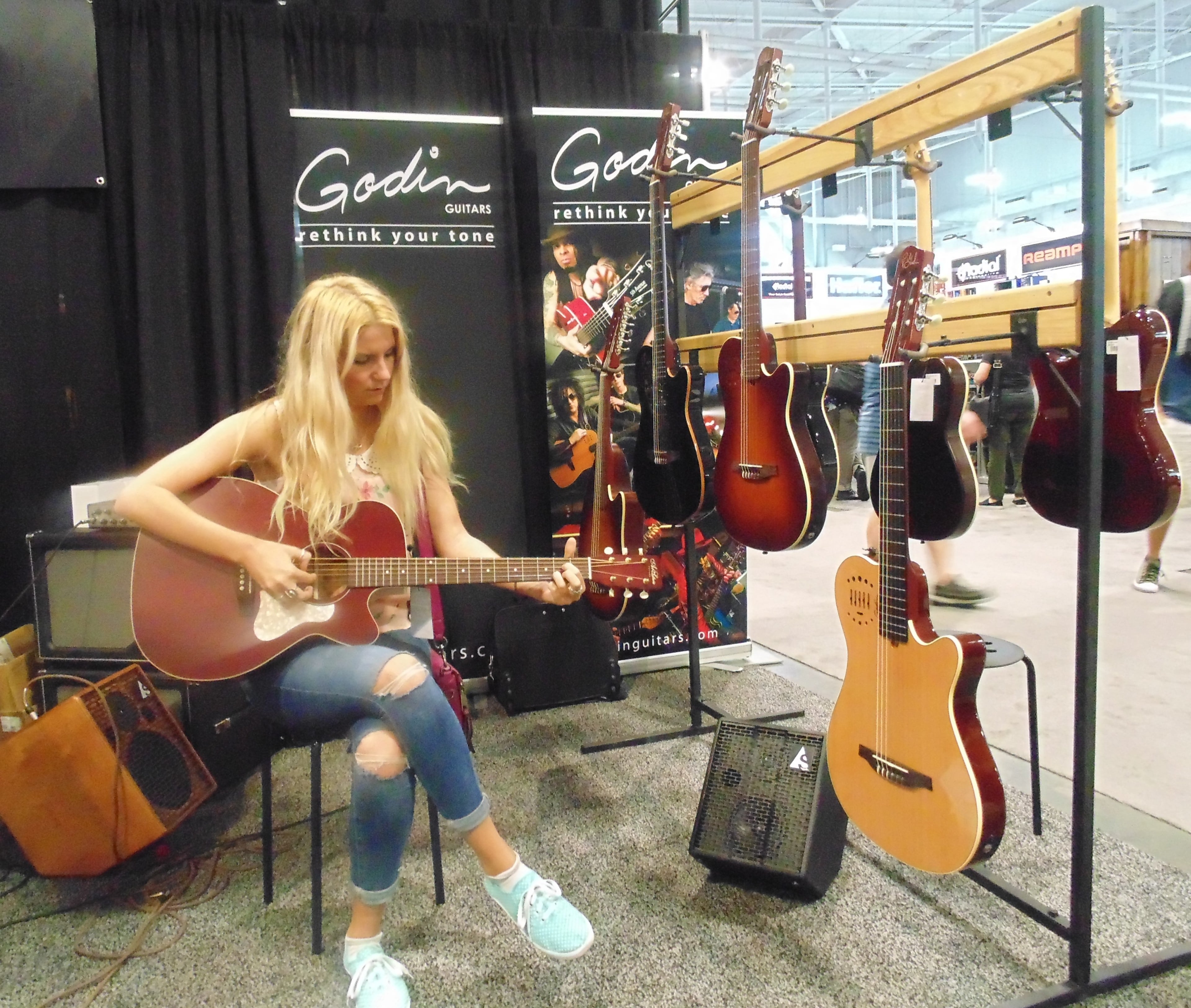 Nashville-based singer/songwriter/vocal harmony specialist Morgan May checks out a guitar from the Art & Lutherie line at the booth of Canadian guitar maker Godin.