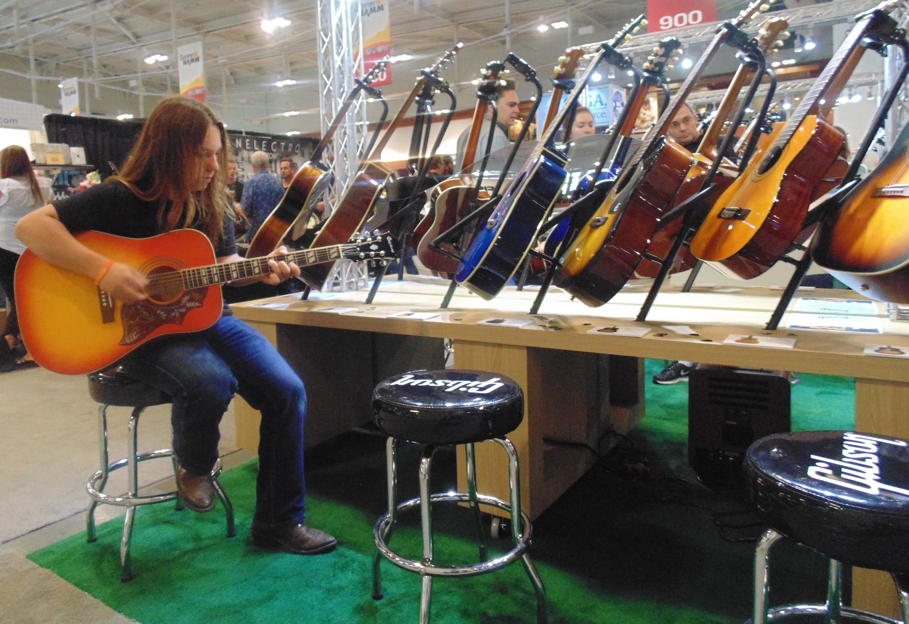 Parker Lanier, with Nashville-based company Mental Case road cases, tries out an Epiphone Hummingbird at the Gibson booth.