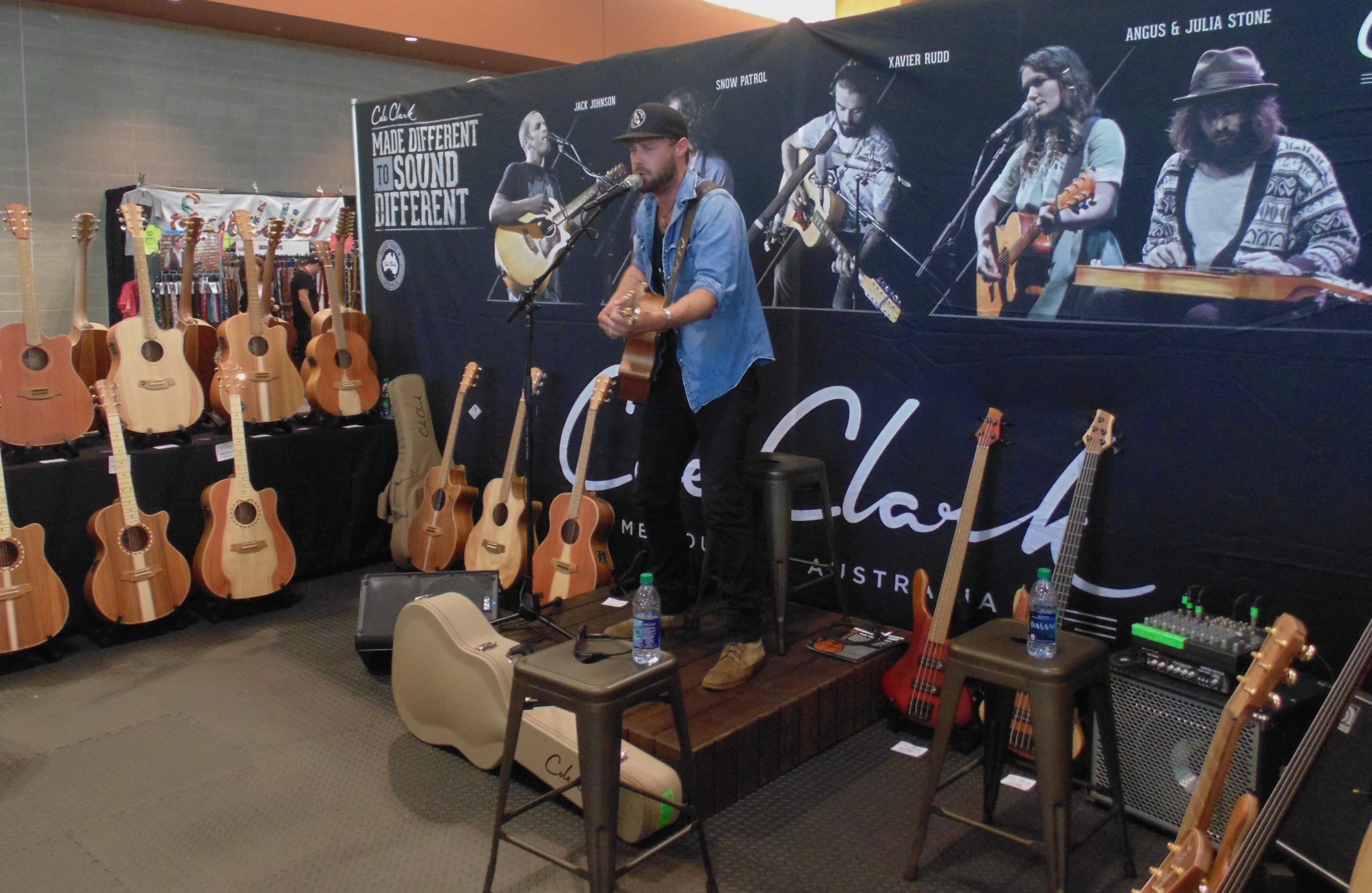 Lewis Brice performs at the booth of Cole Clark Guitars, which is headquartered in Melbourne, Australia.