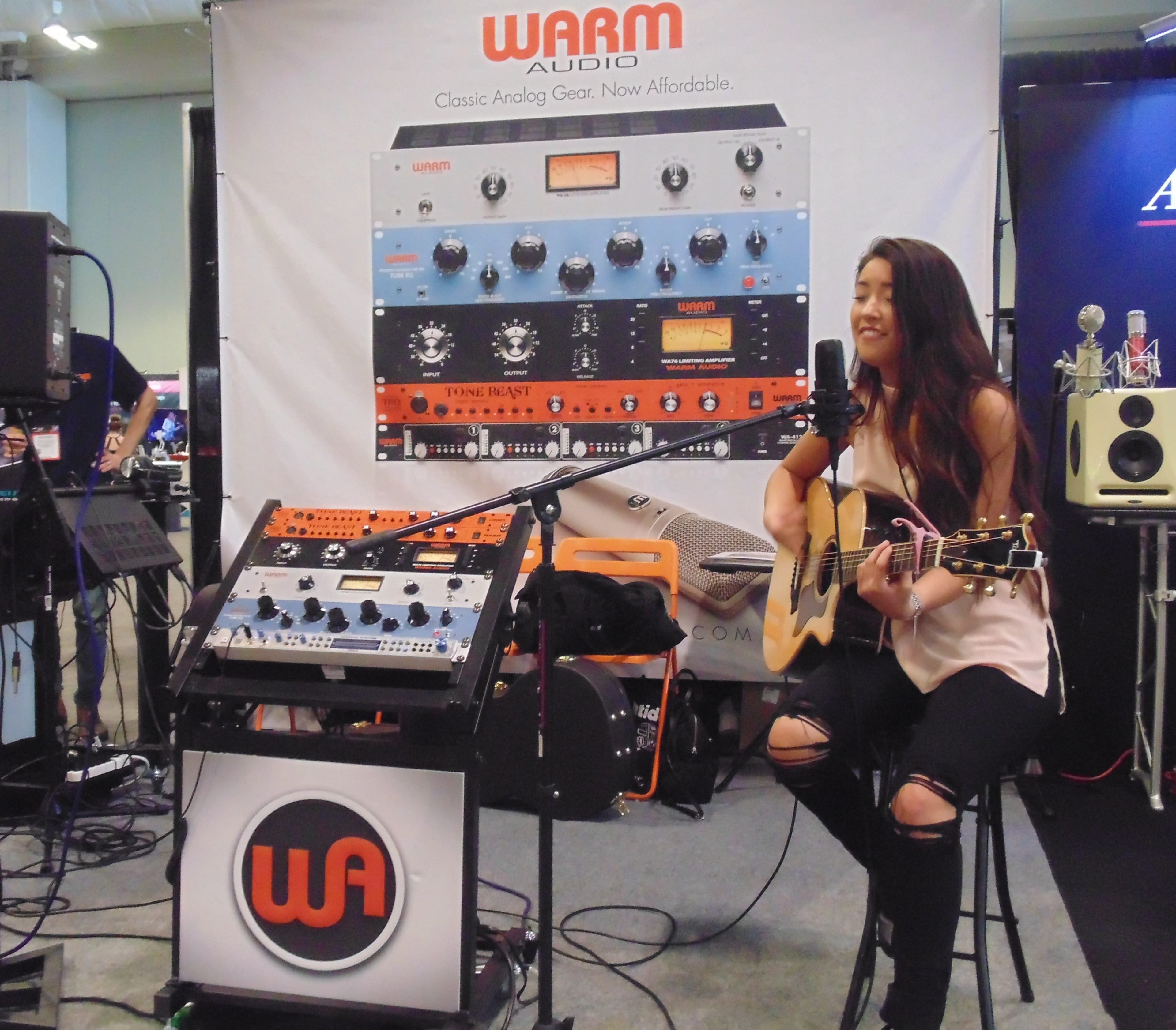 Singer-songwriter Tasji Bachman performs on a Taylor cutaway at the booth of Warm Audio, a manufacturer of microphones and outboard gear in Austin, Texas.