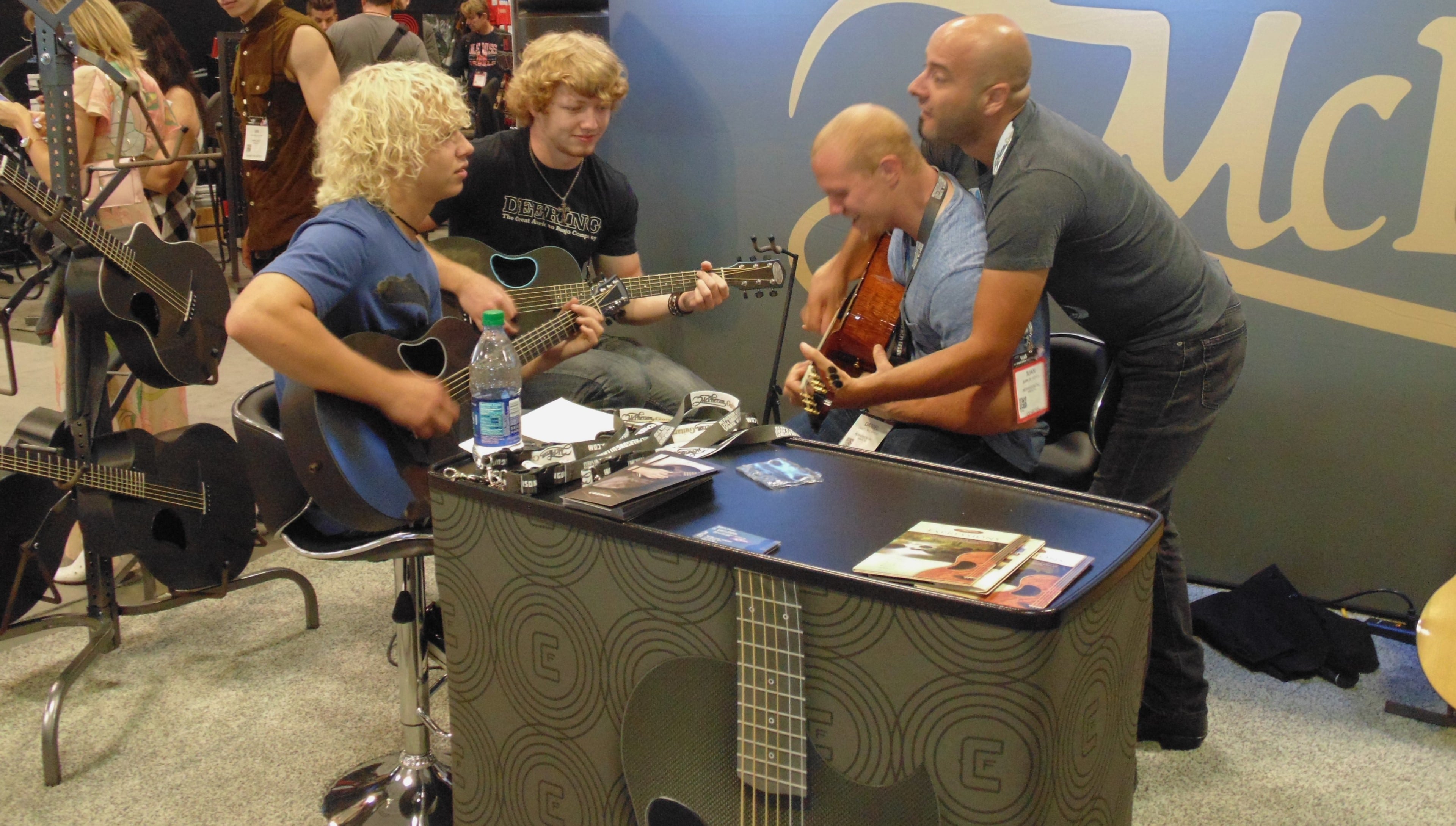 From left, Isaac Moore, Jacob Moore, Daniel Moorhead and Juan De Hoyos do some clusterplucking at the booth of Wisconsin’s McPherson Guitars.