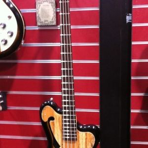 Usually when one things of Hofner basses, it is the iconic violin shaped “Beatle” bass as made famous by Paul McCartney, but this bass shares the larger body of their Verythin semi-hollow guitars. As the name implies, the instrument is only 1.23″ thick, making it even thinner that Gibson’s 335 series of instruments.