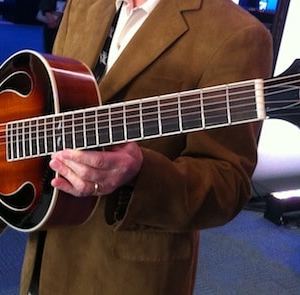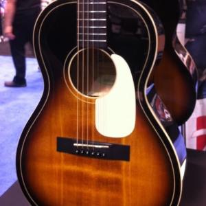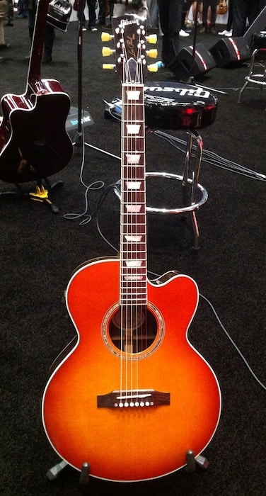 Gibson used the Les Paul name on a prototype acoustic they were showing at their booth. The body is their mini-jumbo shape with a cutaway, but what makes the guitar really intriguing is the pre-amp for plugged-in playing: it has labeling for 12 string, nylon, dobro, bass, banjo and more. Stay tuned.