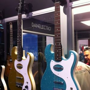 Here is a pair of Danelectro electrics showing off a new sparkle finish and the upgraded adjustable bridge. Based off the designs of the company’s offerings from the ’60s, these guitars keep the instrument’s best features: the semi-hollow body, the original body shape and, of course, the lipstick tube pickups.