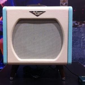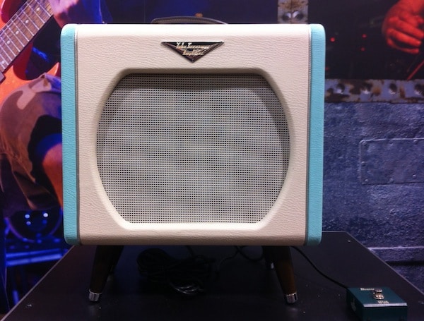 TV stylings of the 1950s are clearly the design influence of this two-tone Ibanez Tube Screamer amp. This 5 watt amp features an 8″ speaker, angled legs, reverb and switchable Tube Screamer circuitry. Also on display were the company’s larger, more powerful amps with a more conventional look.