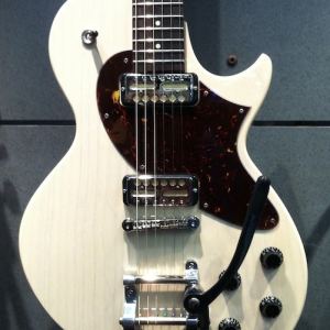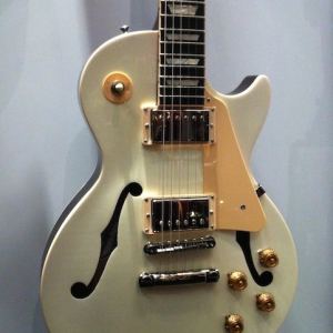 Gibson Memphis division displayed a whole different take on a familiar body shape: the ES-Les Paul. While the guitar has the same outward dimensions of the LP, the body is constructed more like that of an ES-335’s semi-hollow design. Not only is the instrument lighter, but the tone is enhanced while still being feedback resistant. While offered in several traditional Les Paul colors and NOS finishes, this one is Alpine White.