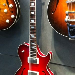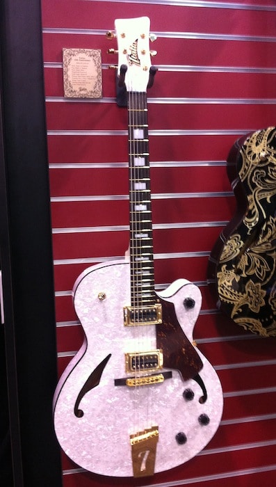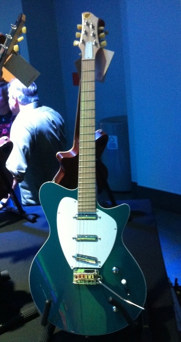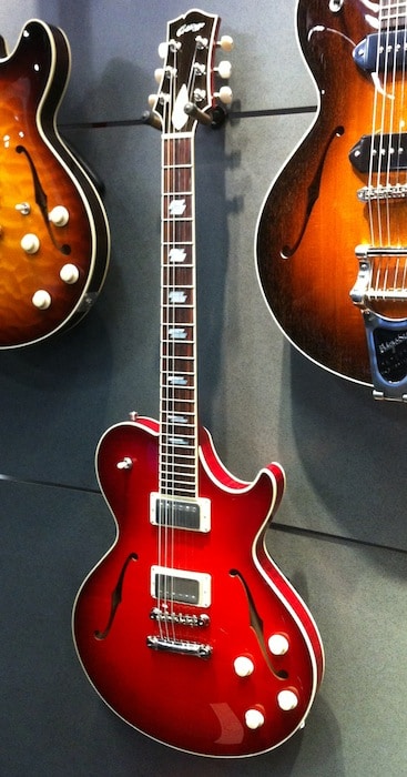 This Collings SoCo LC Deluxe’s red sunburst finish positively glowed under the lights at NAMM. With a 15″ lower bout, the semi-hollow SoCo LC is a slightly more compact, comfortable version of that type of guitar.