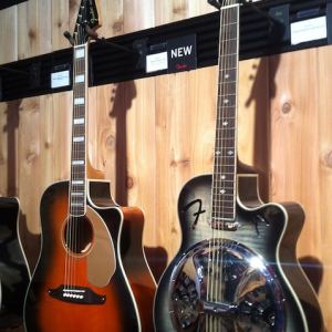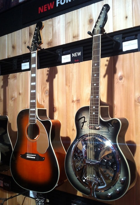 The Kingman ASCE is a new cutaway acoustic from Fender that retains much of the iconic style of the company’s original acoustic guitar line in the 1960s, including Fender’s six-on-a-side headstock. Fender also showed a new electric acoustic resophonic guitar that uses the stylized “F” from the company’s logo for the soundholes.
