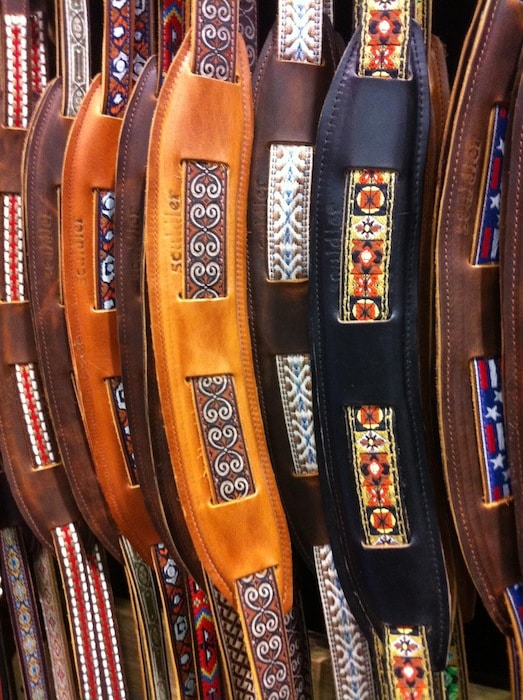 This is in! Souldier straps displayed (among their other offerings) these colorful thin guitar straps with a shoulder pad, a design usually equated with a black or brown all leather strap.