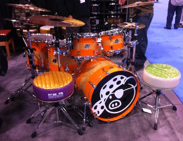 Pork Pie Percussion showed off their vintage inspired tuck and roll vinyl drum thrones, the Duece, but while at the booth it was hard not to notice their drums done up for the show. The Duece is available in a wide range of mix and match color options… and sparkles.
