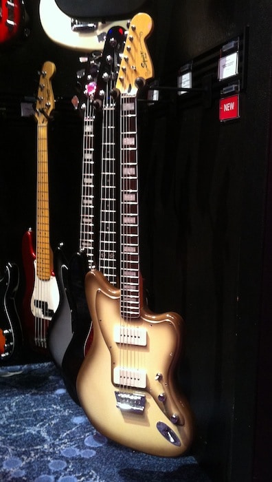 Squire is a brand that falls under Fender’s umbrella, and the Fender design is prevalent throughout their line. This classy instrument is the Vintage Modified Baritone Jazzmaster in the classic Fender Antigua finish.
