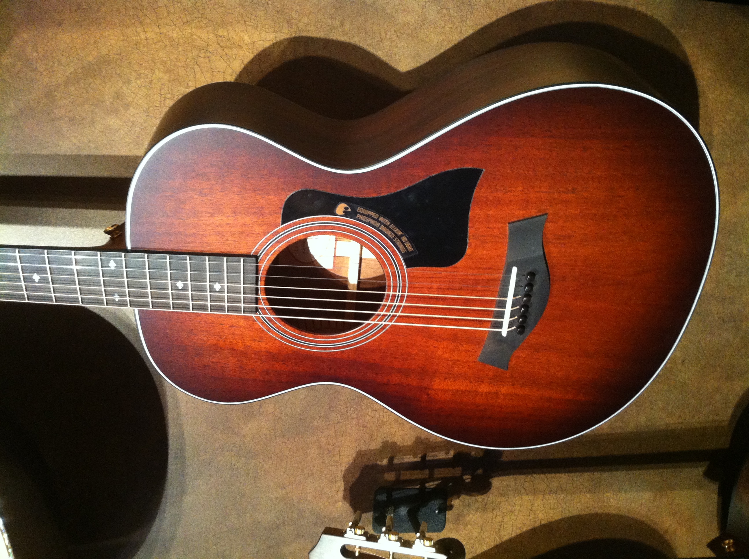 For 2016 Taylor put some emphasis on their 12-fret guitar, including this mahogany top 322e. While 12-fret guitars (number of frets where the neck joins the body) have less frets than their 14-fret counterparts, the bridge is placed closer to the widest part of the body. Some guitarists believe this drives the top more efficiently giving the best tone.