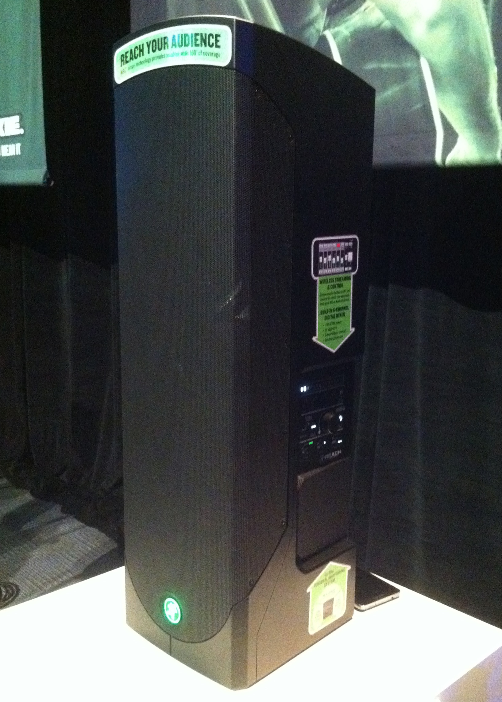 The Reach, Mackie’s portable PA system, has two built-in full-range monitors built into the sides of the cabinet. They either or both sides can be turned on or off as the needs require. The side fills can be used for personal monitoring for the performer, or to increase to the coverage of the speaker to a wide 150 degrees.