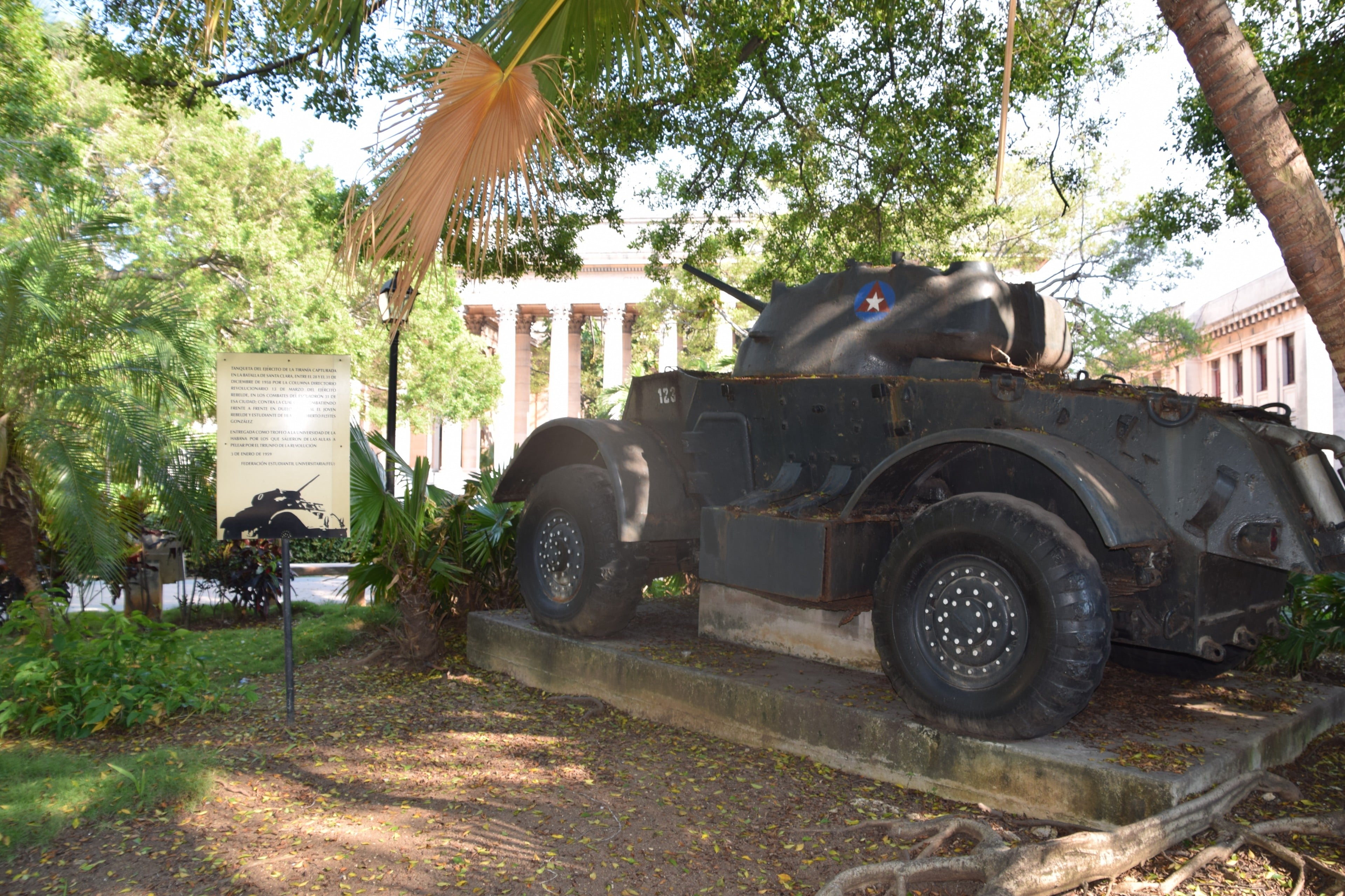 A tank commemorating the Fidel Castro-led 1959 revolution. Castro studied law at the University in the 1940s.