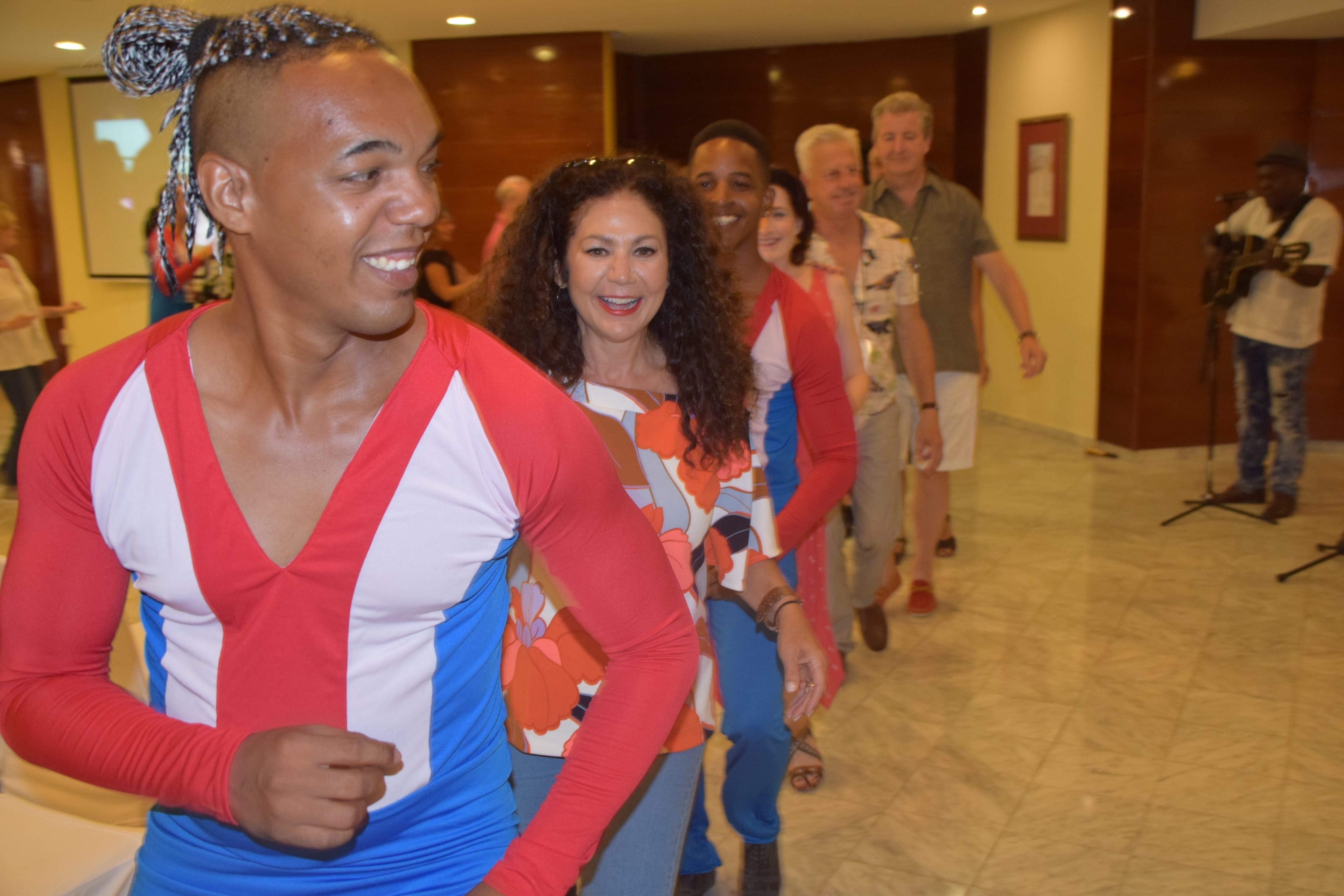 Cuban dancers welcome Wainwright fans at the Melia Habana Hotel.