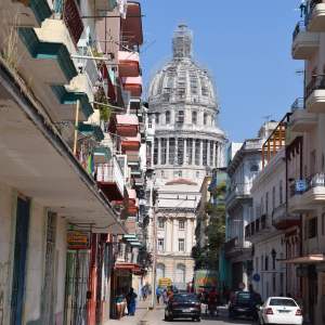 The view of El Capitolio from Calle Barcelona in Central Havana. The building ceased to be the center of government operations after the 1959 revolution. It is scheduled to reopen as the home of the Cuban National Assembly in 2018.